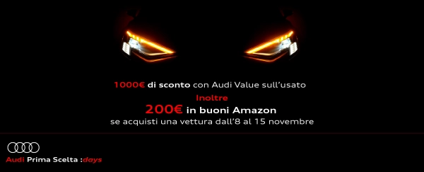 La tua prossima Audi con 1.000€ di extra sconto e se acquisti nella settimana speciale degli Audi Prima Scelta :days, per te 200€ di buoni Amazon.