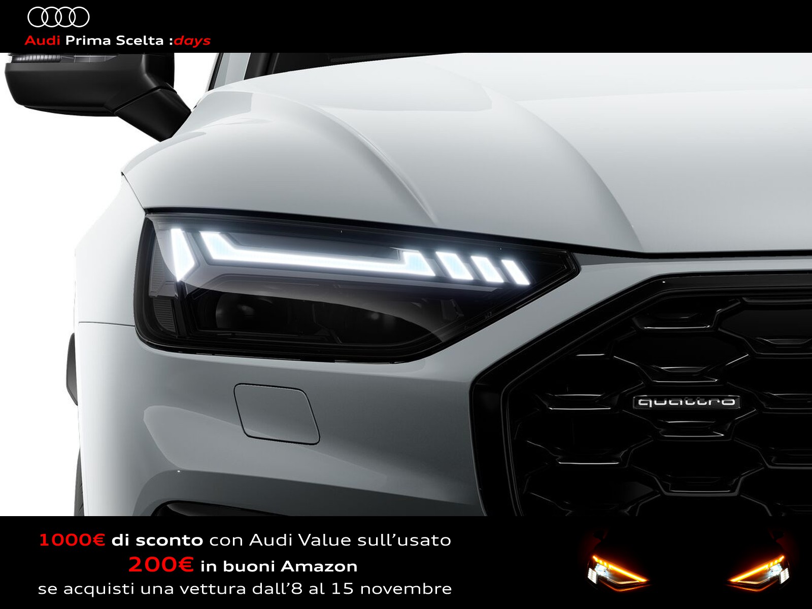 Se l'auto dei tuoi sogni fosse un usato Audi Prima Scelta :plus? Affidatevi all'accuratezza dei nostri 110 controlli, che assicurano lo stesso livello di esclusività e avanguardia delle Audi nuove. Ecco perché siamo sicuri della qualità delle nostre auto e possiamo garantirle fino a quattro anni a partire dalla data d'acquisto. Il nostro usato Audi include anche vetture aziendali con meno di 6 mesi o 6.000 chilometri.