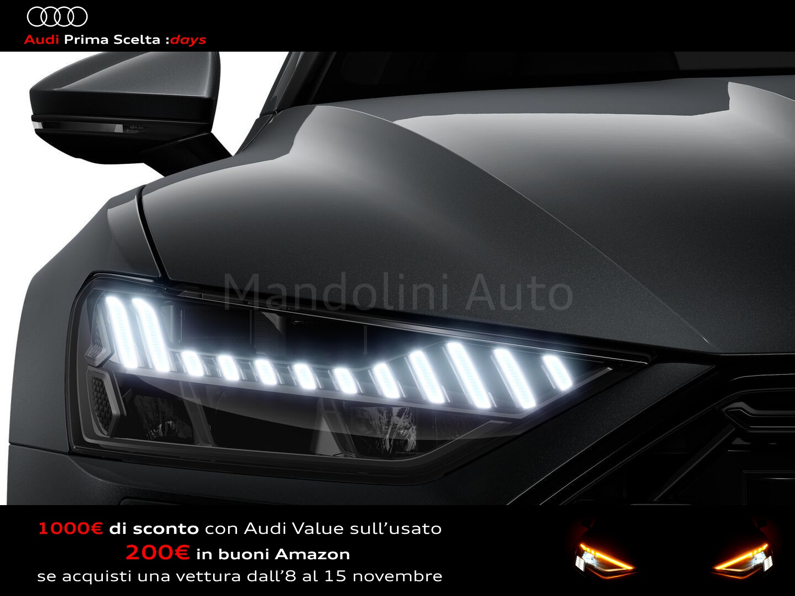 Se l'auto dei tuoi sogni fosse un usato Audi Prima Scelta :plus? Affidatevi all'accuratezza dei nostri 110 controlli, che assicurano lo stesso livello di esclusività e avanguardia delle Audi nuove. Ecco perché siamo sicuri della qualità delle nostre auto e possiamo garantirle fino a quattro anni a partire dalla data d'acquisto. Il nostro usato Audi include anche vetture aziendali con meno di 6 mesi o 6.000 chilometri.